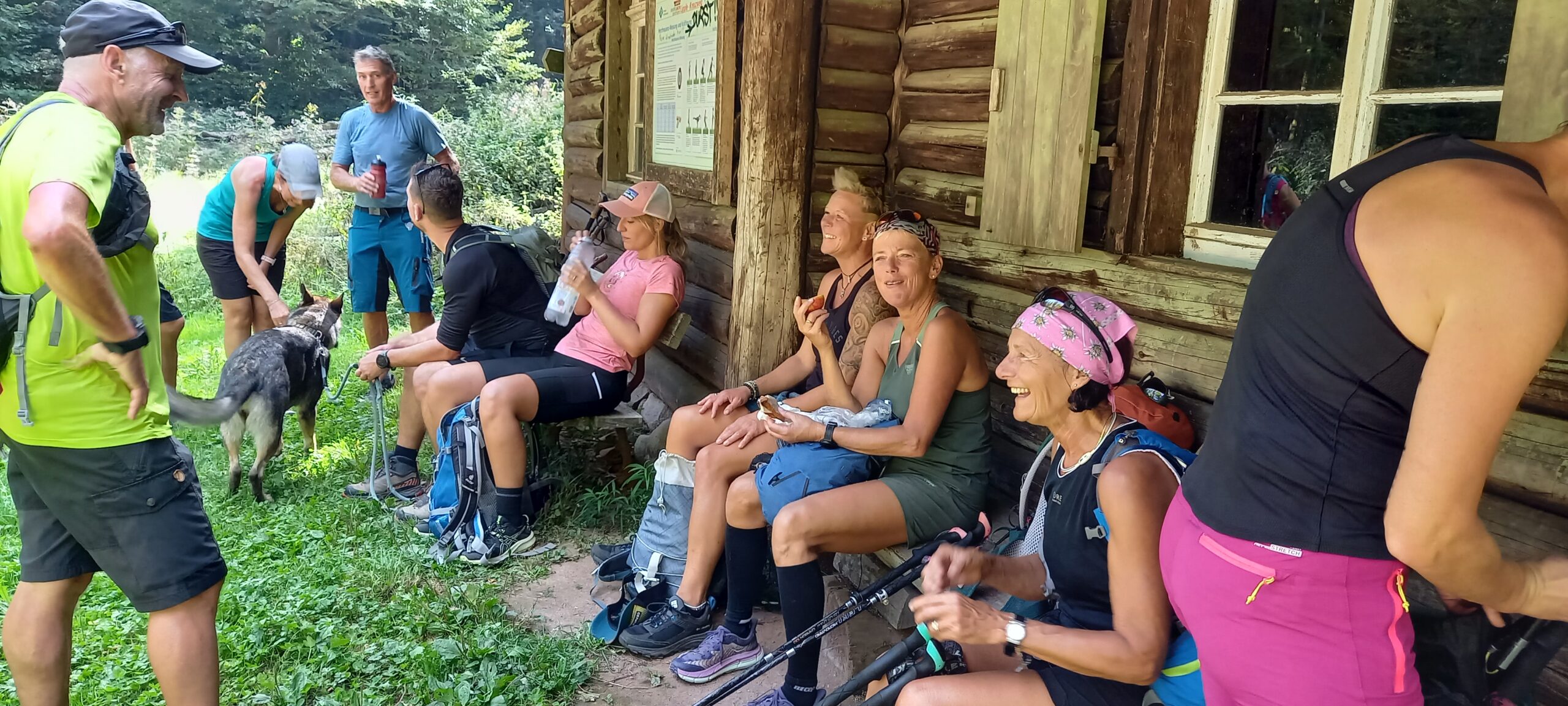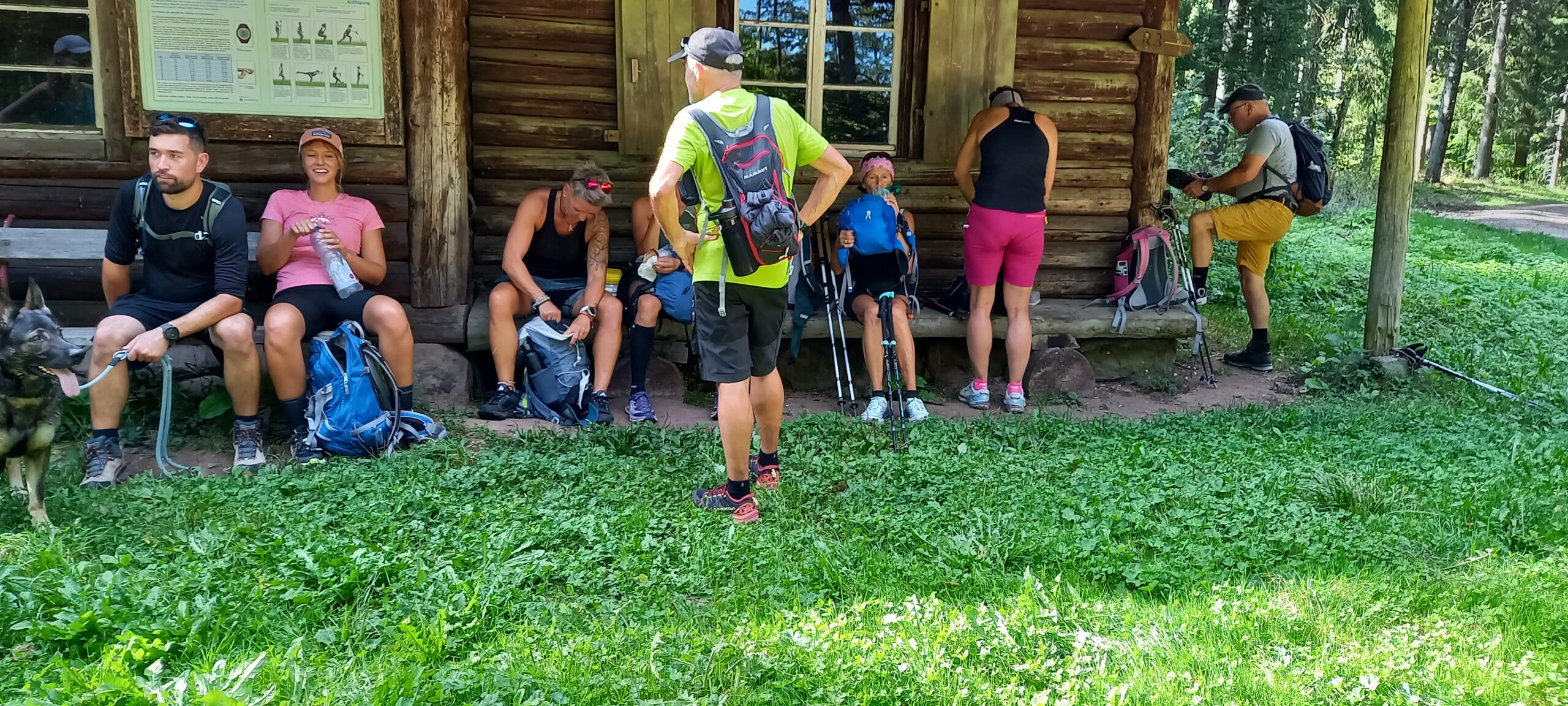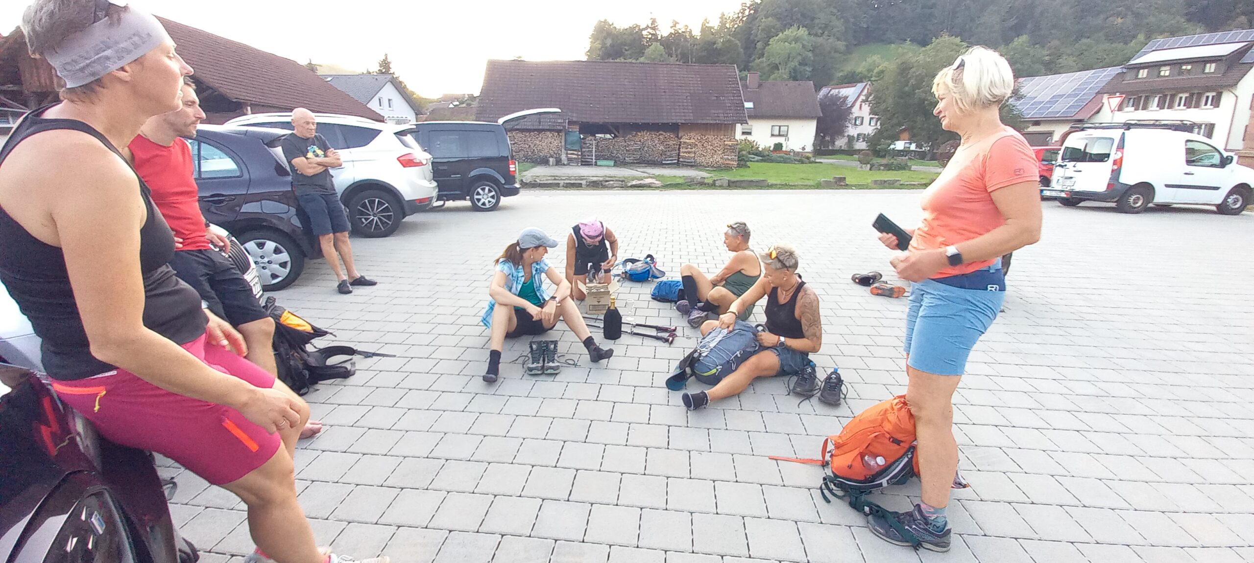 Wir machten uns wieder an den Abstieg über Hohkelch, Richtstatt, zwischen kleinem Wiesental und Münstertal. Am Panoramablick spürten wir dann die eher hochsommerlichen Temperaturen und somit war klar, dass wir ehr die schattige Variante, was zudem auch die schönere ist, nehmen werden. Dabei hatte sich unsere Gruppe getrennt, was aber kein Problem war, denn es waren ja einige ortskundige Teilnehmer dabei und es kurz vorm Haldenhof war, „unsere Mittagslokation“ hat alles super funktioniert. Essen und Trinken und die Bezahlung war flott und tadellos, so konnten wir uns auch bald wieder auf den Weg machen, wir hatten hier streckenmäßig Halbzeit. So haben wir nach einem kurzen Stück Westweg die Möglichkeit über den ehemaligen Skihang zum nordöstlichsten Punkt vom Dorf zu kommen. Weiter über den Kreuzwegpass, Spähnplatz, Meierskopfhütte zur Wassertankstelle auf dem Lipple, wo die Gsellingers aufgenommen wurden. Kaum aus den Augen verloren schlich sich schon wieder eine Pause ein. Alsbald waren wir wieder im Schritt zum Roßbodenweg, welcher zur Gleichenhütte führt. Dort wartete Birgit schon auf uns, trotz allem kam schon wieder der Drang zum Pausieren auf, einige hatten schon angefangen Wurzeln zu schlagen, Bernd machte sich schon Sorgen, dass einigen heute der Po von den vielen Pausen mehr Schmerzen wird, als die Schenkelmuskulatur, aber wir kamen dann wieder los um durch die Grube über den Wilsberg mit wunderschöner Himmelsliege, dem Wasen zur Bücklebodenhütte zu kommen. Da war dann unsere letzte große Pause. Nun schon mit der am Horizont gesehenen Nacht machten wir uns wieder auf die Läufe, kamen bald über den Hasel, Weideschuppen Sallneck, ans Kreuz. Dann runter in die Katzhalde, vorbei am Steinbruch Silbereck, Schillifhof, Kreuzeiche zur Deponie. Hier noch mal mit Sicht zum Belchen und dabei die Feststellung wie groß das Kleine Wiesental ist. Mit diesen Eindrücken noch den Katzensprung zurück zu den Autos, wo Robert schon mit einer Belohnung stand.