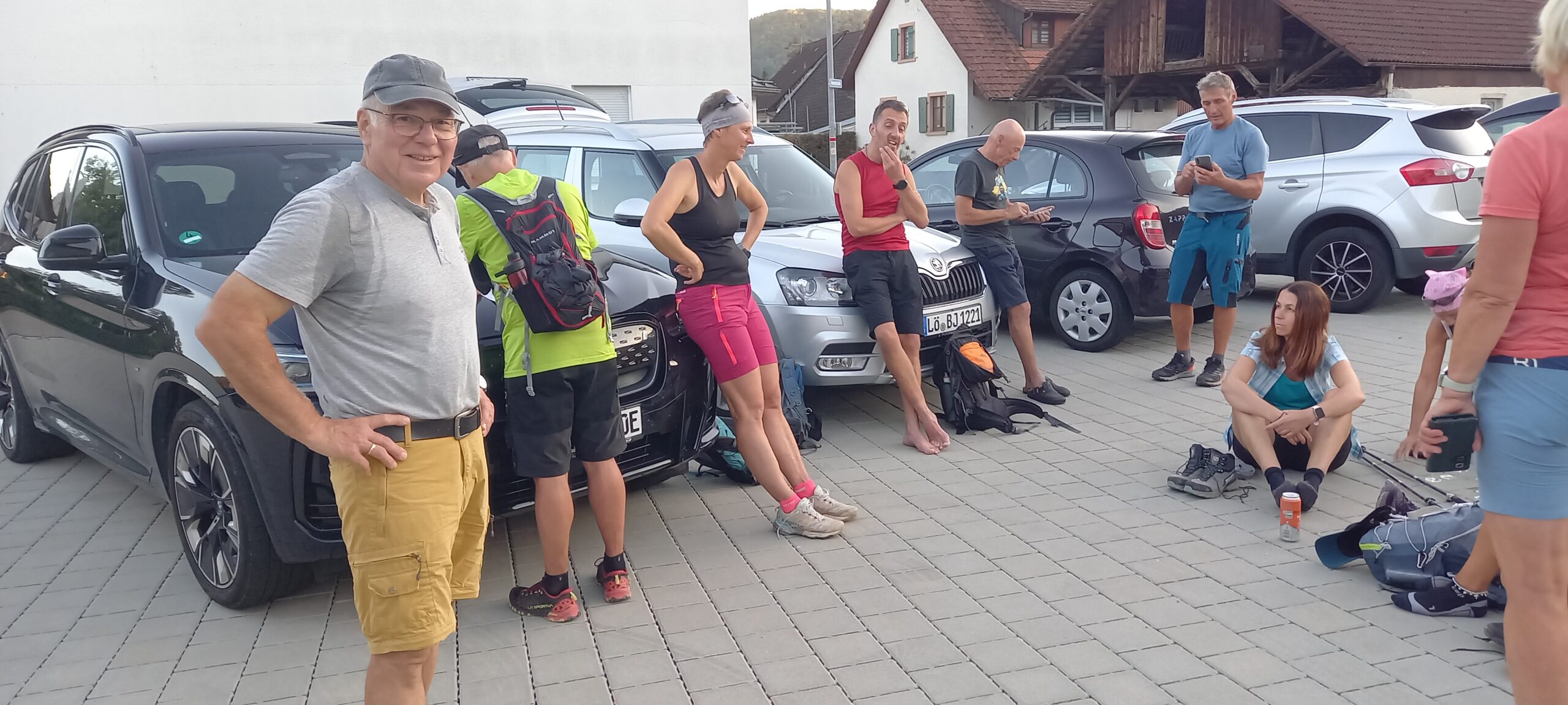 Am 20. September 2025 begaben sich 12 Personen haben sich morgens um fünf Uhr bei lauen Temperaturen, mit bester Laune, zur Wanderung“ einmal ums Dorf getroffen. Fast pünktlich gestartet, sind wir mit sehr gutem Tempo über den Baumgarten, unterhalb der Rothenburg nach Gresgen gekommen, bei immer noch sternenklarer Neumondnacht, mit einer tollen Sichel am Horizont. Dann auf dem Höhenrücken zwischen großem und kleinem Wiesental, mit Verschnaufpause kurz vor der Kophütte, in der Morgendämmerung, kaum Zeit zum Pipi machen, schon war wieder Aufbruchstimmung. So trabten wir weiter, links vom Zeller Blauen, Fröhnder Windrad, Gedenkstätte Wolfsacker, zum Zeiger, Holder, immer wieder mit Blick auf den Belchen. Auf dem Hau durften wir dann noch Jessi und die vierbeinige Dori in unseren Reihen begrüßen. Kurz nach der Sternenschanze haben wir „Znüni“ gemacht. Nach zwanzig minütiger Pause wurden die erleichterten Rucksäcke wieder aufgeschnallt. Am Böllener Eck verabschiedete sich Markus und Tom, sie sind wieder zurück nach Wieslet gelaufen. Für uns wars dann der Letzte aber auch heftigste Anstieg zum Blechen, welcher aber von allen gemeistert wurde, so konnten wir dann am Kreuz unser Gruppenfoto machen. Es gab noch den obligatorischen Gipfelschnaps und für manche noch Kicherwasser.